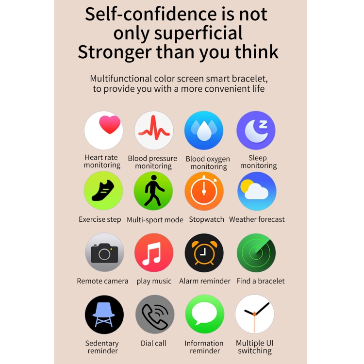 10. Function: Call reminder push, SMS reminder push, WeChat reminder push, QQ reminder push, exercise record (step counting, mileage, etc.), sleep monitoring, sedentary reminder, calorie calculation, stopwatch, raise the hand to brighten the screen, dynamic heart rate, Blood pressure, vibration, exercise mode, remote camera, music control, smart alarm, weather forecast, high-definition large screen, multi-dial switching, drinking water reminder, WeChat exercise, female menstrual cycle, etc.
