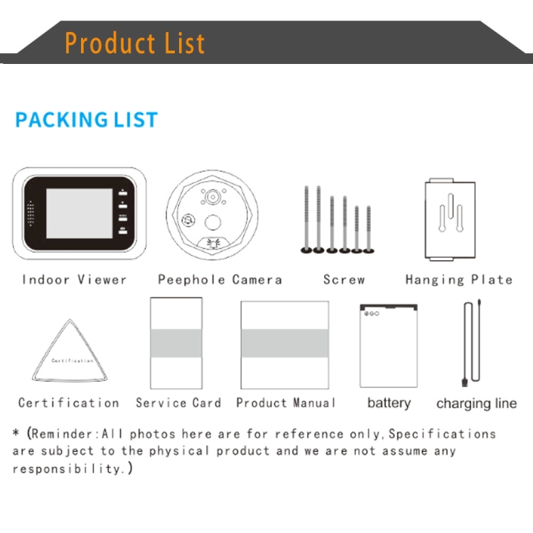 1 x Indoor Viewer 1 x User Manual 1 x Charging Cable 1 x Camera |