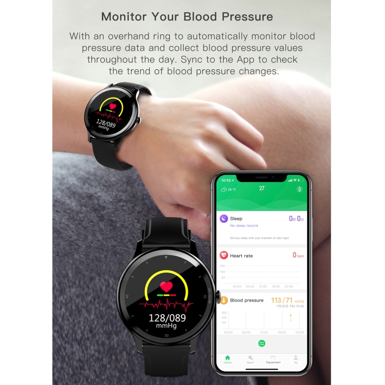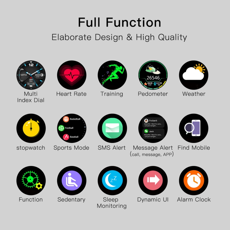 6. Functions: call reminder push, SMS reminder push, WeChat reminder push, QQ reminder push, exercise record (step counting, mileage, etc.), sleep monitoring, sedentary reminder, calorie calculation, stopwatch, dynamic heart rate, blood pressure, vibration, exercise Mode, remote camera, music control, smart alarm, weather forecast, multi-dial switching, WeChat exercise, female menstrual cycle, etc.