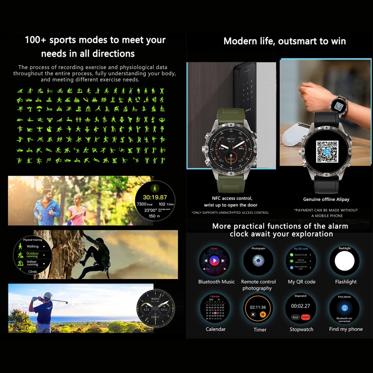 42. Other functions: mini games, my QR code, alarm clock, stopwatch, countdown, Do Not Disturb mode, lift wrist to brighten the screen, find mobile phone, remote control camera, calculator, flashlight, calendar, etc.