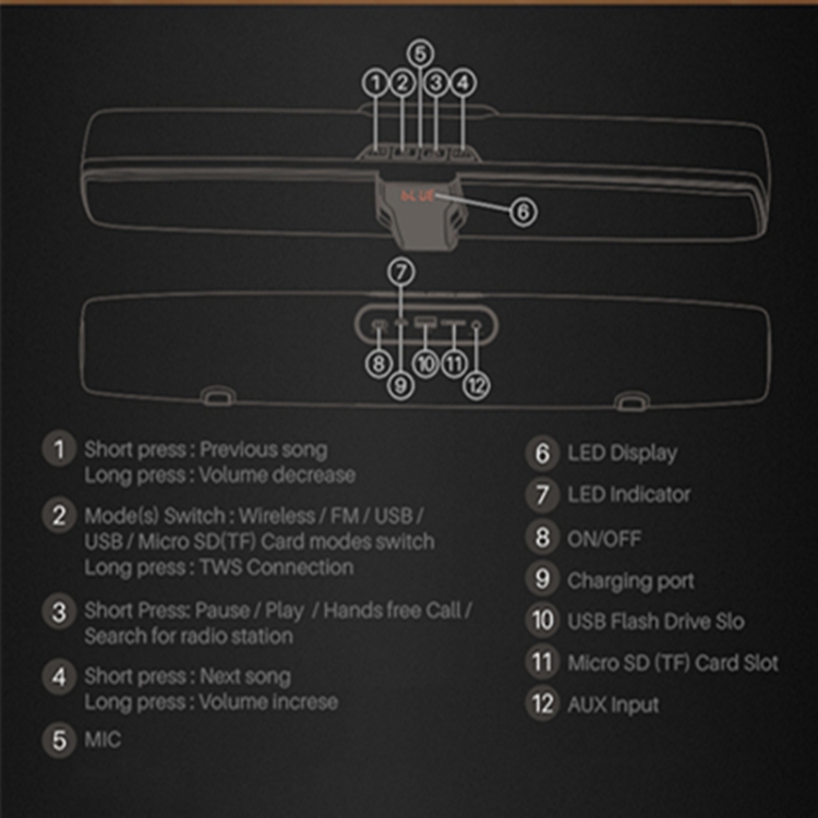 4.TF card music playing,Built-in intelligent TF decoding can play the MP3.WMA.WAV format music in the card stored previoudly
