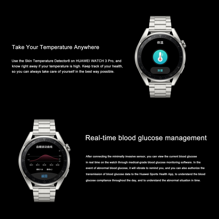 16. After connecting the minimally invasive sensor, you can view the current blood glucose in real time on the watch through the medical-grade blood glucose monitoring software, which can authorize the transfer of blood glucose data to Huawei Sports Health App to understand the blood glucose attainment and timely understanding of abnormal conditions