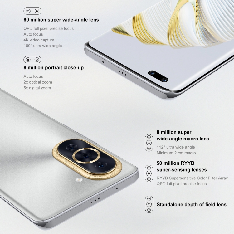 3. Equipped with 5 cameras: Rear cameras: 50MP super-sensing camera (f/1.9 aperture) + 8MP ultra-wide-angle macro camera (f/2.2 aperture) + 2MP portrait blur depth camera (f/2.4 aperture); Front cameras: 60MP ultra-wide-angle focus camera + 8MP portrait close-up camera (f/2.2 aperture). You can capture wonderful moment with ease, and take high quality pictures.