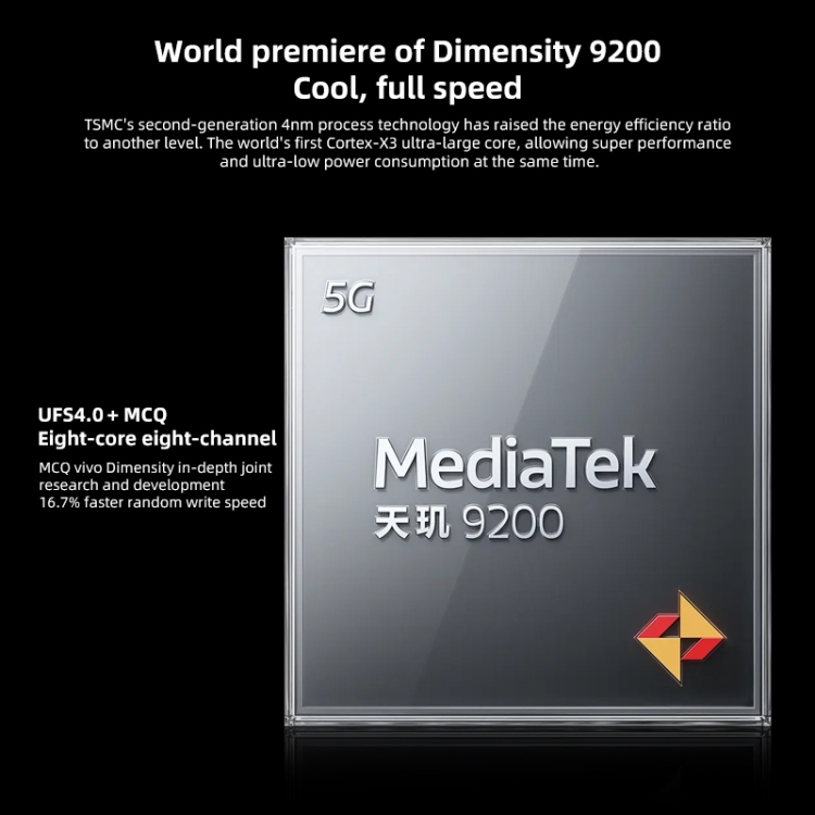 2. MediaTek Dimensity 9200 octa core 4nm, 3.05GHz x 1 + 2.85GHz x 3 + 1.8GHz x 4 processor, high performance, run fast and operate smoothly.