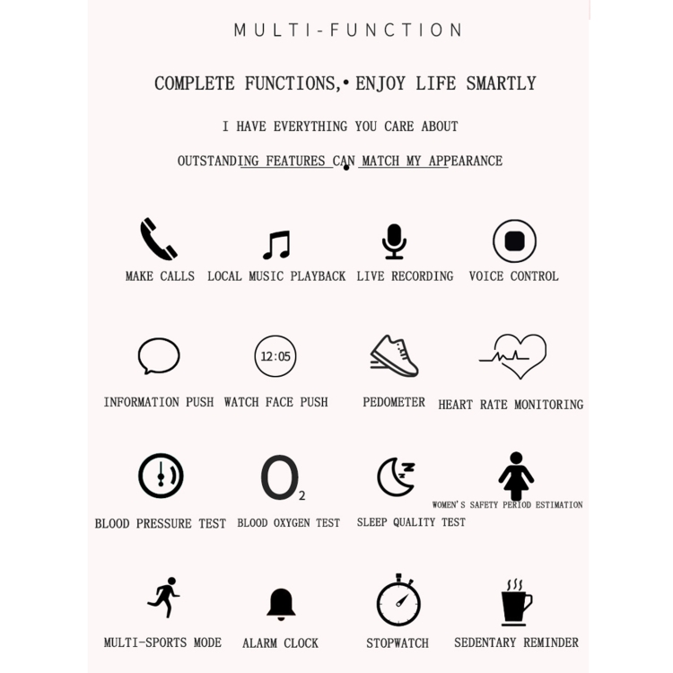 11. Functions: calls, contacts, call records, music playback, custom dials, multi-language, recording, voice control, multi-sports modes, steps, sleep monitoring, heart rate monitoring, blood pressure monitoring, blood oxygen monitoring, GPS running, Alarm clock, sedentary reminder, drinking water reminder, message push, incoming call reminder, weather, calculator, alarm clock, stopwatch, countdown, remote camera, search phone/search settings, raise the wrist to brighten the screen, brightness adjustment, bright screen time, theme selection , Do not disturb mode, female functions (prediction of menstrual period, menstrual period, ovulation period, ovulation day, safe period) during pregnancy, etc.